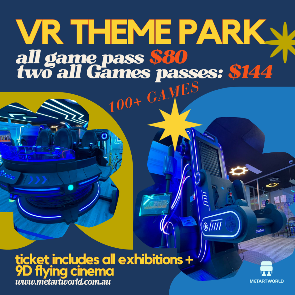 -Access to all our 100+ VR games -Access to all immersive art exhibitions -9D Flying Cinema experience